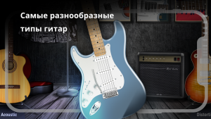 - Выбор из множества типов гитар, таких как акустическая, электрогитара и классическая модель.
