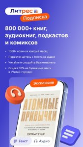 LitRes Читай! – это уникальное приложение для Android, объединяющее жанры электронной книги и аудиокниги. Основная идея заключается в том, чтобы вы легко и удобно могли наслаждаться всеми радостями литературы, переключаясь между чтением и слушанием. С помощью этого приложения вы получаете доступ к огромной библиотеке с миллионом текстовых и аудиофайлов – от новинок до классики.