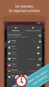- Напоминания: автоматические уведомления о времени кормления, сна или другой активности.