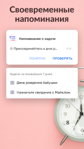 - Устанавливать напоминания с будильником, чтобы ничего не упустить.
