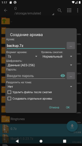 - Создание архивов в форматах 7z, ZIP, TAR и других с выбором уровня сжатия.