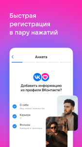VK Знакомства — это приложение для поиска людей с общими интересами. Здесь вы можете завести новые знакомства, найти друзей или даже встретить свою любовь. Удобная регистрация через VK ID и умные алгоритмы подбора пар делают процесс общения простым и увлекательным.
