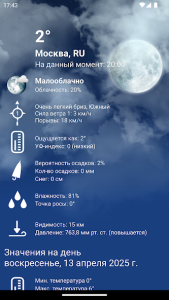 - Информация о температуре, влажности, давлении и скорости ветра.